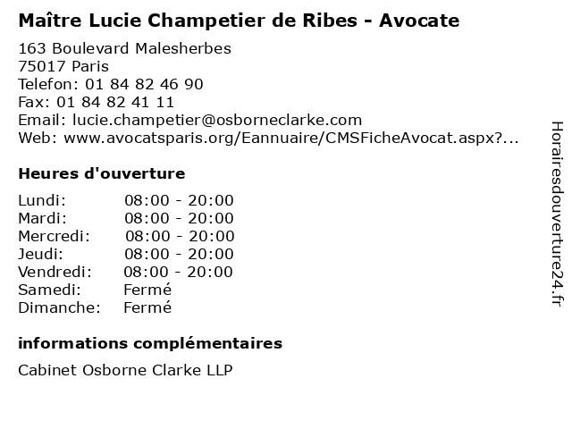 1 Maître Lucie Champetier - Avocate (Distance: 0,00 km) 163 boulevard Malesherbes, 75017 Paris avocate, avocats, cabinet, champetier, conseils, contentieux, juridique, justice, litiges, lucie, maître, services 2 Maître Vincent Champetier - Avocat (Distance: 0,64 km) 43 rue de Courcelles, 75008 Paris avocat, champetier, droit, maître, négociation, vincent 3 Midori Champetier de Ribes (Distance: 0,91 km) 103 boulevard Malesherbes, 75008 Paris cabinet, champetier, de, juridique, justice, midori, ribes 4 Maître Martin Champetier de Ribes - Avocat (Distance: 1,52 km) 136 avenue des Champs Elysées, 75008 Paris avocat, champetier, de, droids, justice, martin, maître, ribes 5 Maître Ludovic Ribes - Avocat (Distance: 1,70 km) 174 Avenue Victor Hugo, 75116 Paris avocat, droit, ludovic, maître, négociation, ribes 6 Maître Saturnin Champetier de Ribes - Avocat (Distance: 1,91 km) 91 rue du Faubourg Saint-Honoré, 75008 Paris avocat, avocats, cabinet, champetier, conseils, contentieux, de, juridique, justice, litiges, maître, ribes, saturnin, services |