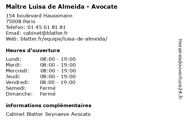1 Maître Luisa Mann - Avocate (Distance: 0,28 km) 42 Rue de Lisbonne, 75008 Paris avocate, avocats, cabinet, conseils, contentieux, juridique, justice, litiges, luisa, mann, maître, services 2 Maître Clémence d'Almeida - Avocate (Distance: 0,98 km) 52 avenue Hoche, 75008 Paris avocat, avocate, clemence, clémence, d'almeida, droit, maître, négociation 3 Dr Elodie Almeida - Chirurgien dentiste (Distance: 2,08 km) 21 Rue Chauchat, 75009 Paris almeida, chirurgien, dentiste, dr, elodie 4 Sonia De Almeida - Masseur-kinésithérapeute (Distance: 2,18 km) 18 Rue Bosquet, 75007 Paris almeida, de, kiné, kinésithérapeute, masseur, rééducation, soin, sonia 5 Dr Mariana Goncalves Almeida Lima - Chirurgien-dentiste (Distance: 2,89 km) 63 Boulevard Jean Jaurès, 92110 Clichy almeida, chirurgien, dentiste, dr, goncalves, lima, mariana, médecin, médecine, médical, pharmaceutique, traitement 6 De Almeida Barbosa Isabel Maria (Distance: 3,03 km) Chez Mme Soares, 75010 Paris almeida, barbosa, isabel, maria, restaurants |
