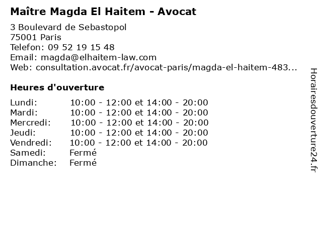 | Lundi | 10:00-12:00 et 14:00-20:00 |