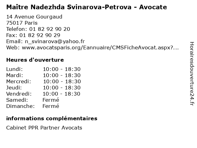 1 Maître Galina Petrova - Avocate (Distance: 2,86 km) 5 boulevard de la Madeleine, 75001 Paris avocat, avocate, droit, galina, maître, négociation, petrova 2 Maître Mariela Petrova - Avocate (Distance: 3,71 km) 182 rue de Rivoli, 75001 Paris avocate, avocats, cabinet, conseils, contentieux, juridique, justice, litiges, mariela, maître, petrova, services 3 Nadezhda Butakova - Psychologue (Distance: 4,13 km) 21 Rue Godefroy, 92800 Puteaux butakova, folie, nadezhda, psychiatre, psychiatrie, psychiatrique, psychologue 4 Petya Petrova Benaich - Sophrologue (Distance: 15,26 km) 21 Boulevard Maurice Berteaux, 94100 Saint-Maur-des-Fossés benaich, medecin, petrova, petya, sante, sophro, sophrologue 5 Maître Sophie Renault - Avocate (Distance: 0,00 km) 14 Avenue Gourgaud, 75017 Paris avocate, avocats, cabinet, conseils, contentieux, juridique, justice, litiges, maître, renault, services, sophie 6 Maître Enguerrand de la Morsanglière - Avocat (Distance: 0,00 km) 14 Avenue Gourgaud, 75017 Paris avocat, avocats, cabinet, conseils, contentieux, de, enguerrand, juridique, justice, la, litiges, maître, morsanglière, services |