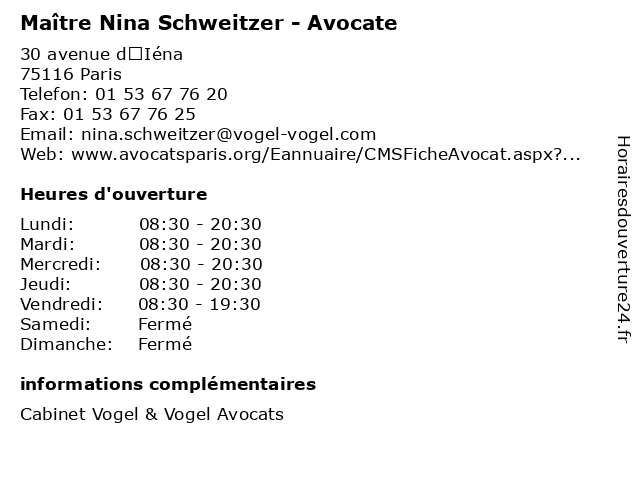 1 Maître Agnès Schmitz Schweitzer - Avocate (Distance: 0,30 km) 10 Place des États-Unis, 75116 Paris agnès, avocat, avocate, droit, maître, négociation, schmitz, schweitzer 2 Maitre Nina Monempour - Avocate (Distance: 0,41 km) 3 Rue Cimarosa, 75116 Paris avocat, avocate, justice, loi, maitre, monempour, nina 3 Maître Nina Caux - Avocat (Distance: 0,49 km) 27 Rue Dumont d'Urville, 75008 Paris avocat, caux, justice, lois, maitre, maître, nina 4 Maître Nina Bowyer - Avocate (Distance: 0,61 km) 66 avenue Marceau, 75008 Paris avocat, avocate, bowyer, droit, maître, nina, négociation 5 Nina Sushi (Distance: 0,95 km) 59 Rue Saint Didier, 75016 Paris bento, gunkans, japonais, makis, nina, restaurant, riz, sushi, sushis 6 Maître Nina Halimi - Avocate (Distance: 1,03 km) 44 avenue des Champs-Elysées, 75008 Paris avocat, avocate, droit, halimi, maître, nina, négociation |