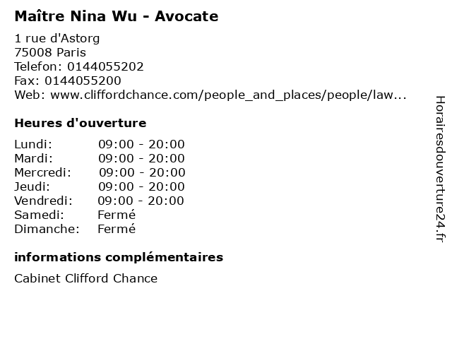 1 Maître Nina Yoshida - Avocate (Distance: 0,00 km) 1 rue d'Astorg, 75008 Paris avocate, avocats, cabinet, conseils, contentieux, juridique, justice, litiges, maître, nina, services, yoshida 2 Maître Nina Sadoun - Avocate (Distance: 0,34 km) 24-26 Rue de la Pépinière, 75008 Paris avocate, avocats, cabinet, conseils, contentieux, juridique, justice, litiges, maître, nina, sadoun, services 3 Maître Nina Charlier - Avocate (Distance: 0,36 km) 32 rue La Boétie, 75008 Paris avocate, avocats, cabinet, charlier, conseils, contentieux, juridique, justice, litiges, maître, nina, services 4 Maître Nina Khalfi - Avocate (Distance: 0,40 km) 15 Rue de Laborde, 75008 Paris avocat, avocate, droit, khalfi, maître, nina, négociation 5 Nina Kendosa (Distance: 0,61 km) 11 rue du Havre, 75008 Paris accessoires, boutique, chaussures, habillements, kendosa, mode, nina 6 |
