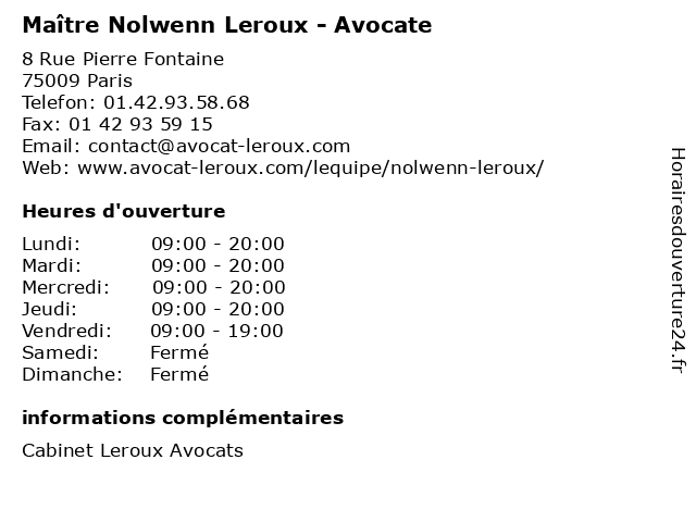 1 Maître Lucie Leroux - Avocate (Distance: 0,85 km) 10 rue Thimonnier, 75009 Paris avocate, avocats, cabinet, conseils, contentieux, juridique, justice, leroux, litiges, lucie, maître, services 2 Maître Xavier Leroux - Avocat (Distance: 1,08 km) 2 rue de la Chaussée d'Antin, 75009 Paris avocat, droit, leroux, maître, négociation, xavier 3 Maître Nolwenn Poisson - Avocate (Distance: 1,40 km) 21 boulevard Malesherbes, 75008 Paris avocate, avocats, cabinet, conseils, contentieux, juridique, justice, litiges, maître, nolwenn, poisson, services 4 Maître Elisabeth Leroux - Avocate (Distance: 1,63 km) 29 Rue des Pyramides, 75001 Paris avocate, avocats, cabinet, conseils, contentieux, elisabeth, juridique, justice, leroux, litiges, maître, services 5 Maître Nolwenn Daïrien - Avocate (Distance: 1,76 km) 47 Rue de Monceau, 75008 Paris avocat, avocate, daïrien, droit, maître, nolwenn, négociation 6 Maître Lucas Leroux - Avocat (Distance: 2,10 km) 72 boulevard de Courcelles, 75017 Paris avocat, droit, leroux, lucas, maître, négociation |