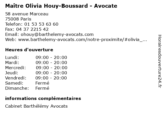 2 Maître Olivia Roche - Avocate (Distance: 0,32 km) 136 avenue des Champs Elysées, 75008 Paris avocat, avocate, droids, justice, maître, olivia, roche 3 Maître Olivia Luzi - Avocate (Distance: 0,34 km) 27 rue Dumont d'Urville, 75116 Paris avocate, avocats, cabinet, conseils, contentieux, juridique, justice, litiges, luzi, maître, olivia, services 4 Maître Olivia Chiron - Avocate (Distance: 0,54 km) 47 avenue Hoche, 75008 Paris avocat, avocate, chiron, droit, maître, négociation, olivia 5 Maître Olivia Feschotte-Desbois - Avocate (Distance: 1,33 km) 32 Rue Rennequin, 75017 Paris avocate, avocats, cabinet, conseils, contentieux, desbois, feschotte, juridique, justice, litiges, maître, olivia, services 6 Galerie Olivia Ganancia (Distance: 3,44 km) 16 Rue Dauphine, 75006 Paris art, artists, galerie, gallery, ganancia, olivia |