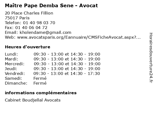 1 Maître Michel Le Pape - Avocat (Distance: 1,38 km) 109 Rue de Courcelles, 75017 Paris avocat, avocats, cabinet, conseils, contentieux, juridique, justice, le, litiges, maître, michel, pape, services 2 Maître Cédric Le Pape - Avocat (Distance: 1,38 km) 109 Rue de Courcelles, 75017 Paris avocat, avocats, cabinet, conseils, contentieux, cédric, juridique, justice, le, litiges, maître, pape, services 3 Dr Wynand Sene - Stomatologue (Distance: 1,70 km) 1 bis Rue des Abbesses, 75018 Paris dr, hématologie, hématologue, immunologique, maladie, sene, stomatologue, wynand 4 Cabinet Médico-dentaire du Dr W. Sene-Dentiste (Distance: 1,71 km) 1 Rue des Abbesses, 75018 Paris cabinet, consultation, dentaire, dentiste, docteur, dr, du, médico, santé, sene, w. 5 Maître Pape Ndiogou Mbaye - Avocate (Distance: 1,84 km) 4 rue de Castellane, 75008 Paris avocate, avocats, cabinet, conseils, contentieux, juridique, justice, litiges, maître, mbaye, ndiogou, pape, services 6 Maître Pape Moussa Ndiaye - Avocat (Distance: 1,88 km) 1 Rue Paul Baudry, 75008 Paris avocat, droit, maître, moussa, ndiaye, négociation, pape |