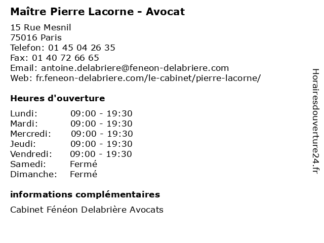1 Maître Michel Lacorne - Avocat (Distance: 4,05 km) 6 place Saint Sulpice, 75006 Paris avocat, avocats, cabinet, conseils, contentieux, juridique, justice, lacorne, litiges, maître, michel, services 2 Beatrice Lacorne - Pédicure-podologue (Distance: 8,18 km) 52 Rue du Général Leclerc, 94270 Le Kremlin-Bicêtre beatrice, lacorne, pedicure, pied, podologue, pédicure, sante 3 Maître Alexandre Pilliet - Avocat (Distance: nan km) 15 Rue Mesnil, 75116 Paris alexandre, avocat, justice, lois, maitre, maître, pilliet 4 Maître Jean-Marie Preel - Avocat (Distance: 0,19 km) 3 avenue Bugeaud, 75116 Paris avocat, avocats, cabinet, conseils, contentieux, jean, juridique, justice, litiges, marie, maître, preel, services 5 Maître Jean-Baptiste Payet-Godel - Avocat (Distance: 0,19 km) 3 avenue Bugeaud, 75116 Paris avocat, avocats, baptiste, cabinet, conseils, contentieux, godel, jean, juridique, justice, litiges, maître, payet, services 6 Maître Romain Bruillard - Avocat (Distance: 0,19 km) 3 avenue Bugeaud, 75116 Paris avocat, avocats, bruillard, cabinet, conseils, contentieux, juridique, justice, litiges, maître, romain, services |