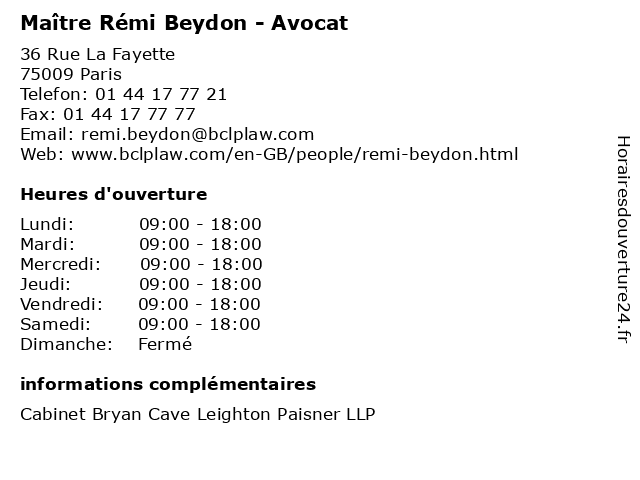 1 Rémi THOR - Coiffeur Mixte, Barbier et Esthétique (Distance: 0,20 km) 18 Rue Laffitte, 75009 Paris barbier, beauté, coiffeur, coiffure, esthétique, et, femmes, hommes, mixte, rémi, salon, style, thor 2 Maître Rémi Tabbagh - Avocat (Distance: 1,32 km) 15 Rue de Laborde, 75008 Paris avocat, droit, maître, négociation, rémi, tabbagh 3 Maître Rémi Dias - Avocat (Distance: 1,73 km) 40/42 rue la Boétie, 75008 Paris avocat, avocats, cabinet, conseils, contentieux, dias, juridique, justice, litiges, maître, rémi, services 4 Dr Rémi Mascali - Ophtalmologue (Distance: 1,94 km) 25 Rue du Renard, 75004 Paris consultation, docteur, dr, mascali, med, médecin, médecine, ophtalmologue, remi, rémi, traitement 5 Maître Rémi Ducloyer - Avocat (Distance: 2,39 km) 1 rue Paul Baudry, 75008 Paris avocat, droit, ducloyer, maître, négociation, rémi 6 Maître Rémi Prades - Avocat (Distance: 2,43 km) 190 Boulevard Haussmann, 75008 Paris avocat, avocats, cabinet, conseils, contentieux, juridique, justice, litiges, maître, prades, rémi, services |