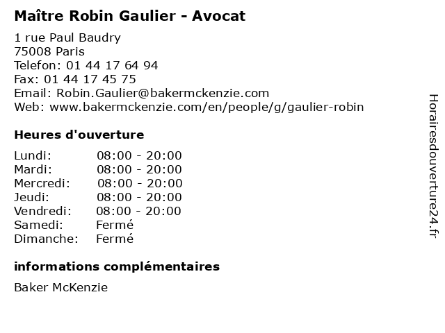 1 Maître Robin Gaulier - Avocat (Distance: 0,06 km) 1 Rue Paul Baudry, 75008 Paris avocat, avocats, civils, droits, gaulier, juridiques, maître, robin 2 Maître Stéphanie Robin-Benardais - Avocate (Distance: 0,19 km) 83 rue La Boétie, 75008 Paris avocat, avocate, benardais, droit, maître, négociation, robin, stéphanie 3 Maître Robin Lenseigne - Avocat (Distance: 0,49 km) 45 avenue Montaigne, 75008 Paris avocat, avocats, cabinet, conseils, contentieux, juridique, justice, lenseigne, litiges, maître, robin, services 4 Maître Catherine Robin - Avocate (Distance: 1,23 km) 137 Rue de l'Université, 75007 Paris avocat, avocate, catherine, droit, maître, négociation, robin 5 Christophe Robin (Distance: 1,77 km) 228 Rue de Rivoli, 75001 Paris christophe, hair salon, robin, salon 6 Dr. Robin Michel - Pediatrics (Distance: 2,23 km) 4 Boulevard Victor Hugo, 92200 Neuilly-sur-Seine docteur, dr., medecins, michel, pediatrics, robin, sante |