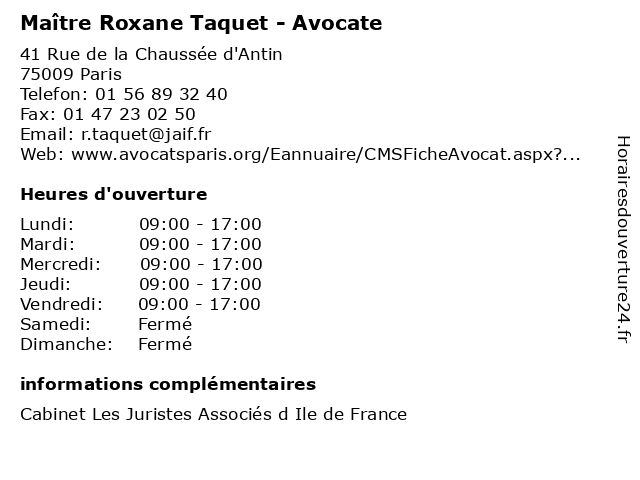 1 Maître Roxane Olivier - Avocate (Distance: 0,27 km) 2 rue de la Chaussée d'Antin, 75009 Paris avocate, avocats, cabinet, conseils, contentieux, juridique, justice, litiges, maître, olivier, roxane, services 3 Maître Alexandra Taquet - Avocate (Distance: 1,96 km) 6 Place de la République Dominicaine, 75017 Paris alexandra, avocate, avocats, cabinet, conseils, contentieux, juridique, justice, litiges, maître, services, taquet 4 Maître Alix Taquet - Avocate (Distance: 2,49 km) 41 Avenue de Friedland, 75008 Paris alix, avocat, avocate, droit, maître, négociation, taquet 5 Dr Roxane Colette - Psychiatre (Distance: 2,92 km) 21B Rue Pierre Leroux, 75007 Paris colette, dr, hypnothérapie, psychiatre, roxane, santé, thérapie 6 Dr Roxane Mamou - Pédiatre (Distance: 3,67 km) 63 Boulevard Jean Jaurès, 92110 Clichy dr, mamou, médecin, médecine, médical, pharmaceutique, pédiatre, roxane, traitement |