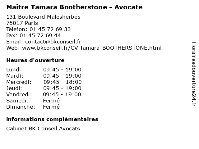1 Maître Tamara Anstett-Berthiaud - Avocate (Distance: 0,89 km) 15 Rue de Laborde, 75008 Paris anstett, avocate, avocats, berthiaud, cabinet, conseils, contentieux, juridique, justice, litiges, maître, services, tamara 2 Tamara (Distance: 2,60 km) 15 rue de Richelieu, 75001 Paris bar, bistro, cuisine de saison, restaurant, tamara, zéro déchet 3 Maître Tamara Palaux - Avocate (Distance: 2,72 km) 53 Rue des Belles Feuilles, 75116 Paris avocat, avocate, droit, maître, négociation, palaux, tamara 4 Ospina Posse Tamara Matea (Distance: 3,37 km) 2 b Rue Championnet, 75018 Paris matea, ospina, posse, restaurants, tamara 5 Dr Tamara Makovec - Médecin généraliste (Distance: 5,63 km) 12 bis Rue de la Villette, 75019 Paris docteur, dr, generaliste, généraliste, makovec, medecin, médecin, soins, tamara 6 Dr Tamara Kornblum - Pédiatre (Distance: 5,77 km) 16 Rue Salomon de Rothschild, 92150 Suresnes dr, enfant, kornblum, pediatre, pédiatre, sante, soins, tamara |