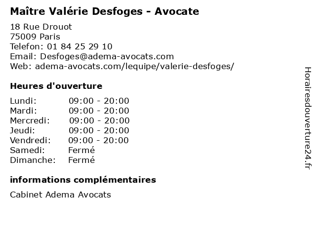 1 Maître Valérie Desforges - Avocate (Distance: 0,00 km) 18 Rue Drouot, 75009 Paris avocat, avocate, bureau, desforges, droit, maître, service, valérie 2 Maître Valérie Marais - Avocate (Distance: 0,00 km) 18 Rue Drouot, 75009 Paris avocate, avocats, cabinet, conseils, contentieux, juridique, justice, litiges, marais, maître, services, valérie 3 Dr Valérie Frech - Chirurgien-dentiste (Distance: 0,19 km) 26 Rue Laffitte, 75009 Paris chirurgien, consultation, dentiste, docteur, dr, frech, med, médecin, médecine, secrétariat, traitement, valérie 4 Dr Valérie Russo - Chirurgien-dentiste (Distance: 0,28 km) 13 Place Kossuth, 75009 Paris chirurgien, consultation, dentiste, docteur, dr, med, medecine, medical, médecin, russo, traitement, valérie 5 Valérie du Chaffaut - Chiropracteur (Distance: 0,43 km) 45 Rue de Trévise, 75009 Paris chaffaut, chiropracteur, du, medical, médecines, secretariat, thérapie, valérie 6 Maître Valérie Perret - Avocat (Distance: 0,55 km) 18 Rue Notre Dame de Lorette, 75009 Paris avocat, justice, lois, maitre, maître, perret, valérie |