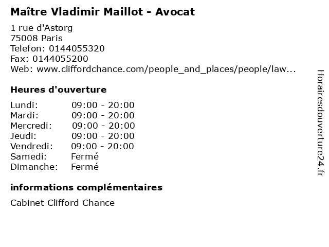 1 Maître Vladimir Ganem - Avocat (Distance: 0,75 km) 48 rue Cambon, 75001 Paris avocat, droit, ganem, maître, négociation, vladimir 2 Dr Sandrine Maillot-Roy - Chirurgien de la main (Distance: 1,39 km) 20 Rue Laffitte, 75009 Meudon chirurgien, de, dr, la, maillot, main, médecins, médicaments, roy, sandrine, santé, secrétariat, spécialiste 3 Maître Clément Maillot-Bouvier - Avocat (Distance: 1,73 km) 57 Avenue d'Iéna, 75116 Paris avocat, bouvier, clément, droit, maillot, maître, négociation 4 Hôtel Fertel Maillot (Distance: 1,73 km) 269 Boulevard Pereire, 75017 Paris chambres, fertel, hebergement, hotel, hôtel, maillot 5 Maître Alain Maillot - Avocat (Distance: 1,85 km) 69 avenue Victor Hugo, 75116 Paris alain, avocat, droit, maillot, maître, négociation 6 Maître Vladimir Rostan d’ Ancezune - Avocat (Distance: 2,04 km) 43-45 avenue Kléber, 75116 Paris ancezune, avocat, avocats, cabinet, conseils, contentieux, d’, juridique, justice, litiges, maître, rostan, services, vladimir |