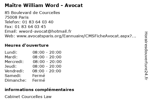 | 1 Maître William Chappel - Avocat (Distance: 0,24 km) 4 avenue Van Dyck, 75008 Paris avocat, avocats, cabinet, chappel, conseils, contentieux, juridique, justice, litiges, maître, services, william 2 Dr William Akakpo - Chirurgien urologue (Distance: 0,45 km) 64 Rue de Monceau, 75008 Paris akakpo, chirurgie, chirurgien, dr, general, soins, urologue, william 4 Dr William Dahan - Généraliste (Distance: 0,94 km) 7 Rue Washington, 75008 Paris care, clinic, dahan, dentist, dr, france, généraliste, health, service, william 5 Maître William Fumey - Avocat (Distance: 1,46 km) 18 Rue de Liège, 75009 Paris avocat, avocats, cabinet, conseils, contentieux, fumey, juridique, justice, litiges, maître, services, william 6 William Levesque - Pédicure-podologue (Distance: 2,04 km) 35 Avenue du Roule, 92200 Neuilly-sur-Seine cheville, levesque, orteil, pied, podologue, pédicure, william |