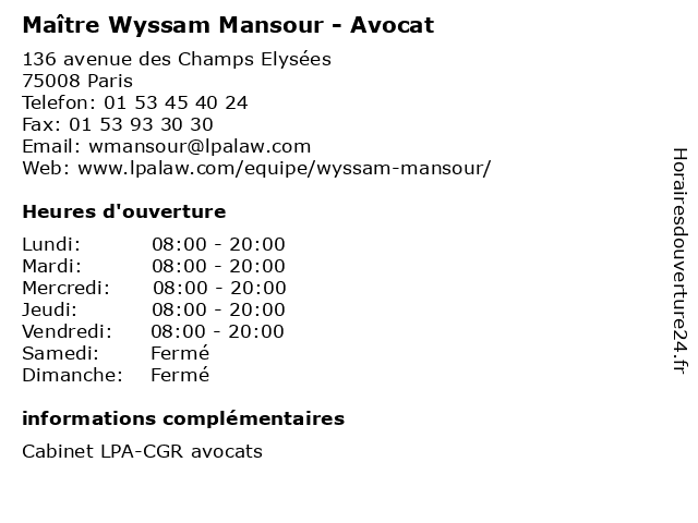 1 Maître Mansour Othmani - Avocat (Distance: 1,16 km) 18 rue du Débarcadère, 75017 Paris avocat, avocats, cabinet, conseils, contentieux, juridique, justice, litiges, mansour, maître, othmani, services 2 Maître Amine Mansour - Avocat (Distance: 1,41 km) 1 rue d'Astorg, 75008 Paris amine, avocat, droit, mansour, maître, négociation 3 Dr Aïda Ait Mansour - ORL (Distance: 3,17 km) 9 Rue du Bouloi, 75001 Paris 75001, ait, aïda, cabinet, docteur, dr, mansour, orl, paris 4 Dr Aïda Ait Mansour - ORL (Distance: 3,56 km) 36 Rue d'Assas, 75006 Paris ait, aïda, consultation, docteur, dr, mansour, med, médecin, médecine, orl, traitement 5 Bab Mansour - La Medina (Distance: 4,48 km) 9 Avenue des Gresillons, 92230 Gennevilliers bab, bar, bistro, bistrot, brasserie, café, la, mansour, medina, restaurant, restauration 6 |