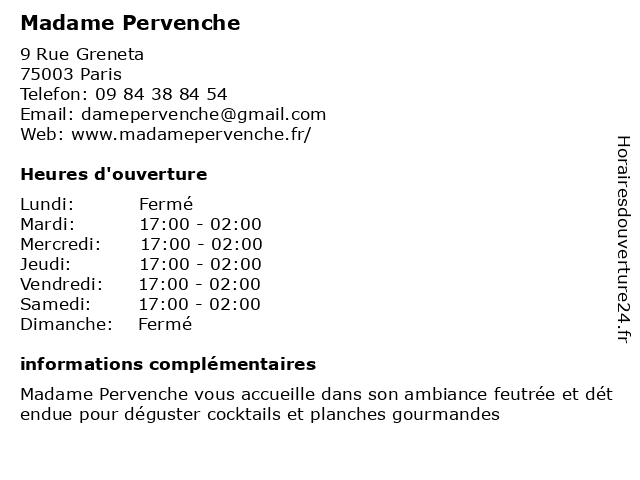 1 Madame Charlotte (Distance: 1,20 km) 7 Rue Du Grand Prieure, 75011 Paris bar, bistro, bistrot, brasserie, café, charlotte, madame, pub, restaurant, restauration, resto, traiteur 2 Madame Sophie Thomassin (Distance: 1,44 km) 111 Rue La Fayette, 75010 Paris madame, restaurants, sophie, thomassin 3 Madame Messieurs (Distance: 1,58 km) 80 Rue de Maubeuge, 75009 Paris café, crêpes, dessert, madame, messieurs, restaurant, wine 4 Dr. Madame T. Pacheff- Diététicienne (Distance: 1,78 km) 16 rue de l'Aqueduc, 75010 Paris consultation, diététicienne, docteur, dr., madame, pacheff, santé, t. 5 Madame Audrey Attia (Distance: 1,96 km) 10 Rue Cambon, 75001 Paris agents, assurance, assurances, attia, audrey, courtiers, madame, services 6 Hotel La Villa Madame (Distance: 2,39 km) 44 Rue Madame, 75006 Paris bar, chambres, hotel, la, madame, restaurant, villa |