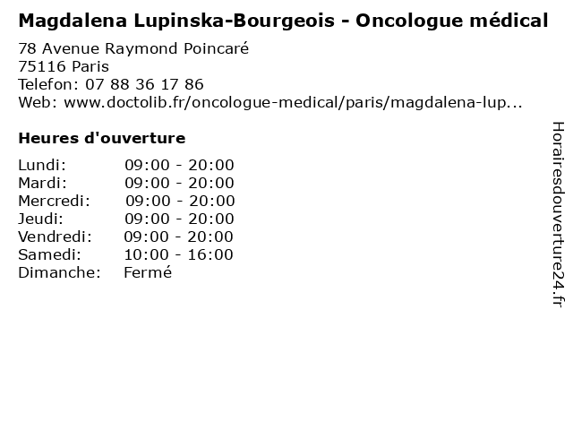 1 Cabinet médical Sontay (Distance: 0,20 km) 6 Rue de Sontay, 75116 Paris cabinet, consultation, docteur, médecins, médical, santé, secrétariat, sontay 2 Cabinet médical d'Eylau (Distance: 0,45 km) 34 Avenue d'Eylau, 75116 Paris 34, avenue, cabinet, consultation, d'eylau, docteur, médecins, médical, santé, secrétariat 3 Claire Pietin-Vialle - Gynécologue médical et obstétrique (Distance: 0,47 km) 134 Avenue Victor Hugo, 75116 Paris claire, docteur, et, gynecologue, gynécologue, médical, obstretricien, obstétrique, pietin, sante, vialle 4 Dr Naouel Ahdad-Yata - Gynécologue médical et obstétrique (Distance: 0,49 km) 26 Rue Boissière, 75116 Paris ahdad, dr, et, gynécologue, médical, naouel, obstétrique, yata 5 Maître Guillaume Bourgeois - Avocat (Distance: 0,52 km) 4 Rue Dumont d'Urville, 75116 Paris avocat, bourgeois, droit, guillaume, maître, négociation 6 Dr Sophie Legenderie - Gynécologue médical et obstétrique (Distance: 0,62 km) 55 Avenue Bugeaud, 75116 Paris consultation, docteur, dr, et, gynécologue, legenderie, med, médecin, médecine, médical, obstétrique, sophie, traitement |