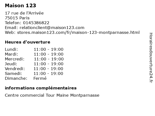 1 Maison 123 (Distance: 1,93 km) 76bis rue du Commerce, 75015 Paris 123, accessoires, habillement, maison, mode, vetement 2 Maison 123 (Distance: 2,35 km) 101 porte Berger, 75001 Paris 123, accessoires, habillement, maison, mode, vetement 3 Maison 123 (Distance: 5,31 km) 60 Rue de Sablonville, 92200 Neuilly-sur-Seine 1.2.3, 123, accessoires, maison, mode, vêtements 4 Maison 123 (Distance: 6,33 km) 57/59 Rue Henri Barbusse, 92110 Clichy 1.2.3, 123, femme, habillement, magasin, maison, mode 5 Maison 123 (Distance: 8,26 km) 42 rue du Midi, 94300 Vincennes 123, boutiques, maison, robe, vestes, vetemenes 6 Maison 123 (Distance: 8,31 km) 2 Place de La Défense, 92092 La Defense 123, boutiques, maison, robe, vestes, vetemenes |