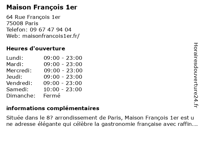 1 60 Rue François 1er Paris 75008 (Distance: 0,03 km) 60 Rue François 1er, 75008 Paris 1er, 60, 75008, commerce électronique, dermatologie, françois, grossiste, magasin d'équipements pour le massage, magasin de produits cosmétiques, magasin d’accessoires de mode, magasin général, paris, rue, station de cure 2 John Lobb Paris (François 1er) (Distance: 0,07 km) 51 rue François 1er, 75008 Paris 1er, accessories, collections, fashion, françois, john, lobb, paris, shoes 3 Maître François Baylion - Avocat (Distance: 0,07 km) 51 rue François 1er, 75008 Paris avocat, baylion, droit, françois, maître, négociation 4 Maître François Brunet - Avocat (Distance: 0,14 km) 6 Rue Christophe Colomb, 75008 Paris avocat, avocats, brunet, cabinet, conseils, contentieux, françois, juridique, justice, litiges, maître, services 5 Maître François Millet - Avocat (Distance: 0,25 km) 58 avenue Marceau, 75008 Paris avocat, avocats, cabinet, conseils, contentieux, françois, juridique, justice, litiges, maître, millet, services 6 Maître François Lepelletier-Beaufond - Avocat (Distance: 0,26 km) 49 Avenue des Champs-Élysées, 75008 Paris avocat, beaufond, droit, françois, lepelletier, maître, négociation |