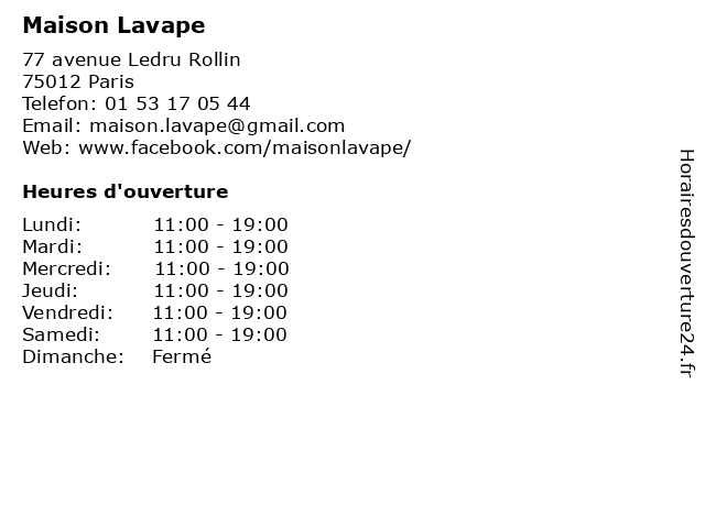 | Lundi | 11:00-19:00 |