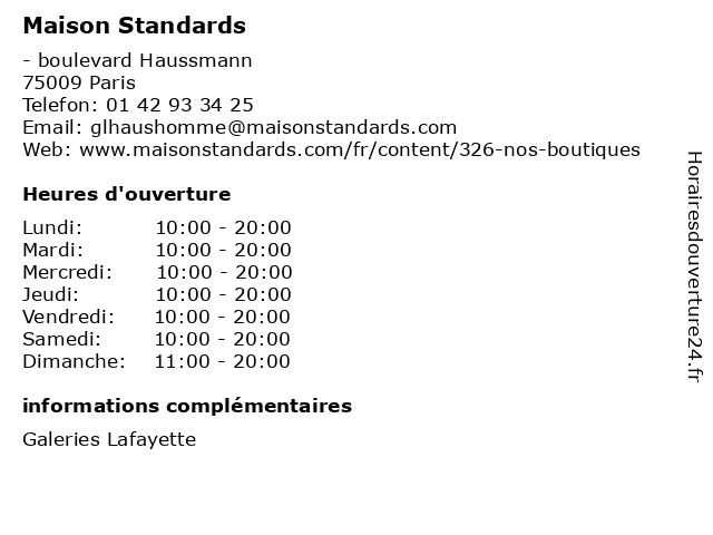 1 Maison Standards (Distance: 1,85 km) 22 rue Beaurepaire, 75010 Paris accessoires, magasins, maison, prêt à porter, standards, vêtements 2 Maison Standards (Distance: 1,93 km) 36 rue de la Verrerie, 75004 Paris accessoires, magasins, maison, prêt à porter, standards, vêtements 3 Maison Standards (Distance: 2,08 km) 25 rue de Poitou, 75003 Paris accessoires, magasins, maison, prêt à porter, standards, vêtements 4 Maison Standards (Distance: 2,29 km) 68 Rue Bonaparte, 75006 Paris accessoires, magasins, maison, prêt à porter, standards, vêtements 5 Tiffany & Co (Distance: 0,00 km) 40 Boulevard Haussmann, 75009 Paris accessoires, co, mode, prêt à porter, tiffany, vêtements 6 La Vaissellerie (Distance: 0,00 km) 80 Boulevard Haussmann, 75008 Paris artisanat d'art, la, magasins, papeterie, services, vaissellerie |