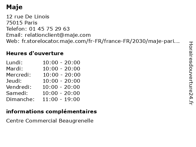 2 Maje (Distance: 2,94 km) 24 rue de Sèvres, 75007 Paris accessoires, habillements, maje, mode, vêtement 5 Maje (Distance: 4,35 km) 9 rue de la Monnaie, 75001 Paris accessoires, habillements, maje, mode, vêtement 6 Maje (Distance: 5,11 km) 55 Rue De La Verrerie, 75004 Paris accesoires, femme, jeans, maje, pantalons, tendances, vestes, vetements |