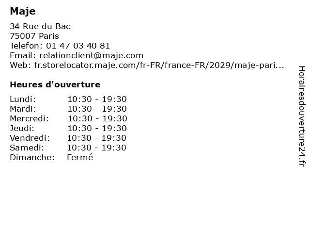1 Maje (Distance: 0,75 km) 24 rue de Sèvres, 75007 Paris accessoires, habillements, maje, mode, vêtement 2 Maje (Distance: 1,10 km) 9 rue de la Monnaie, 75001 Paris accessoires, habillements, maje, mode, vêtement 5 Maje (Distance: 1,88 km) 55 Rue De La Verrerie, 75004 Paris accesoires, femme, jeans, maje, pantalons, tendances, vestes, vetements 6 |