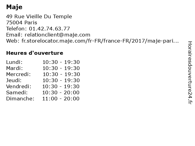 1 Maje (Distance: 0,37 km) 55 Rue De La Verrerie, 75004 Paris accesoires, femme, jeans, maje, pantalons, tendances, vestes, vetements 2 Maje (Distance: 0,39 km) 12 Rue Des Francs Bourgeois, 75004 Paris chaussures, femme, maje, mode, pulls, sacs, vetements 3 Maje (Distance: 0,44 km) 100 rue Saint Antoine, 75004 Paris accessoires, habillements, maje, mode, vêtement 5 Maje (Distance: 1,16 km) 9 rue de la Monnaie, 75001 Paris accessoires, habillements, maje, mode, vêtement 6 Maje (Distance: 2,59 km) 24 rue de Sèvres, 75007 Paris accessoires, habillements, maje, mode, vêtement |