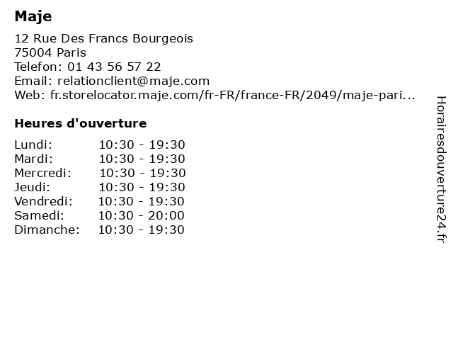 2 Maje (Distance: 0,73 km) 55 Rue De La Verrerie, 75004 Paris accesoires, femme, jeans, maje, pantalons, tendances, vestes, vetements 3 Maje (Distance: 1,54 km) 9 rue de la Monnaie, 75001 Paris accessoires, habillements, maje, mode, vêtement 4 Maje (Distance: 2,61 km) 34 Rue du Bac, 75007 Paris chaussures, femme, maje, mode, pulls, sacs, vetements 5 Maje (Distance: 2,90 km) 24 rue de Sèvres, 75007 Paris accessoires, habillements, maje, mode, vêtement 6 Maje (Distance: 3,15 km) 48 Cour Saint-Emilion, 75012 Paris chaussures, femme, maje, mode, pulls, sacs, vetements |