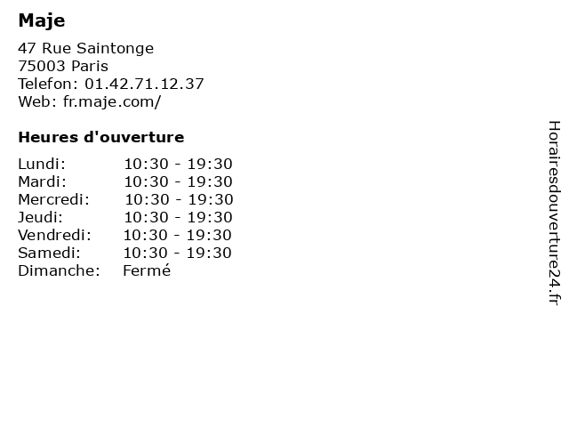 1 Maje (Distance: 0,70 km) 12 Rue Des Francs Bourgeois, 75004 Paris chaussures, femme, maje, mode, pulls, sacs, vetements 3 Maje (Distance: 0,90 km) 100 rue Saint Antoine, 75004 Paris accessoires, habillements, maje, mode, vêtement 4 Maje (Distance: 1,01 km) 55 Rue De La Verrerie, 75004 Paris accesoires, femme, jeans, maje, pantalons, tendances, vestes, vetements 5 Maje (Distance: 1,39 km) 19 Rue Montmartre, 75001 Paris accessoires, habillement, maje, mode, vêtements 6 Maje (Distance: 1,66 km) 9 rue de la Monnaie, 75001 Paris accessoires, habillements, maje, mode, vêtement |