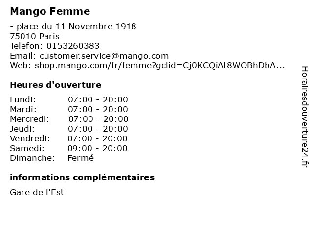 1 Mango Femme (Distance: 4,39 km) 21-25 cours de Vincennes, 75020 Paris accessoires, femme, habillements, mango, mode, vêtement 2 Mango Femme (Distance: 4,80 km) 44 Avenue du Maine, 75015 Paris accessoires, femme, habillements, mango, mode, vêtement 3 Mango (Distance: 0,80 km) 112 rue de Maubeuge, 75010 Paris mango, pret a porter femmes, services, station 4 Mango (Distance: 1,85 km) 1 rue Pierre Lescot, 75001 Paris chaussures, lingerie, mango, mode enfant, mode femmes, mode hemmes, sport 5 mango (Distance: 1,96 km) 6 boulevard des Capucines, 75009 Paris accessoires, habillements, mango, mode, vêtement 6 Mango - femme-enfant (Distance: 2,13 km) 82 Rue de Rivoli, 75004 Paris boutique, enfant, femme, habillement, mango, mode |