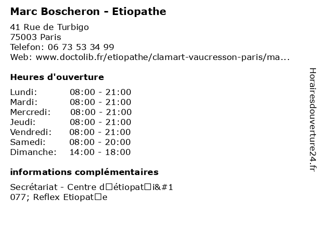 1 Benjamin Cirille - Etiopathe (Distance: 0,00 km) 41 Rue de Turbigo, 75003 Paris benjamin, cirille, consultation, docteur, etiopathe, med, médecin, traitement 2 Adrien Blanchart - Etiopathe (Distance: 0,00 km) 41 Rue de Turbigo, 75003 Paris adrien, blanchart, etiopathe, massages, médecine, étiopathe, étiopathie 3 Charlotte Dupre - Etiopathe (Distance: 0,00 km) 41 Rue de Turbigo, 75003 Paris charlotte, docteur, dupre, etiopathe, massages, étiopathe, étiopathie 4 Marc El Yasni - Sophrologue (Distance: 0,04 km) 35 Rue de Turbigo, 75003 Paris el, marc, medecin, sante, sophro, sophrologue, yasni 5 Dr Jean-Marc Renaudin - Médecin généraliste (Distance: 0,16 km) 29 Rue de Turbigo, 75002 Paris dr, généraliste, jean, marc, médecin, médecine, médical, pharmaceutique, renaudin, secrétariat, traitement 6 Maître Jean-Marc Perez - Avocat (Distance: 0,18 km) 60 Boulevard Sébastopol, 75003 Paris avocat, avocats, cabinet, conseils, contentieux, jean, juridique, justice, litiges, marc, maître, perez, services |