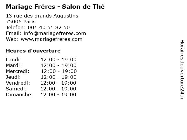 1 Mariage Frères - Comptoir de thés (Distance: 0,00 km) 13 Rue des Grands Augustins, 75006 Paris comptoir, de, frères, infusion, mariage, shop, tea, thés 2 Frères des Hommes (Distance: 0,10 km) 2 rue de Savoie, 75006 Paris association, des, française, frères, hommes 3 Un Dimanche à Paris (Salon de thé) (Distance: 0,19 km) 4-6-8 Cour du Commerce Saint André, 75006 Paris boisson, de, dimanche, nourriture, paris, restaurant, salon, service, thé, un 4 Salon de Thé Delyan (Distance: 0,72 km) 8 Rue saint martin, 75004 Paris de, delyan, paris, salon, salon de thé, thé 5 Dalloyau - Salon de thé (Distance: 0,74 km) 2 place Edmond Rostand, 75006 Paris chocolats, cocktails, dalloyau, de, macarons, patisseries, salon, thé 6 Sébastien Gaudard - LE SALON DE THÉ (Distance: 1,27 km) 1 rue des Pyramides, 75001 Paris bakery, de, desserts, gaudard, le, patisserie, salon, sébastien, thé |