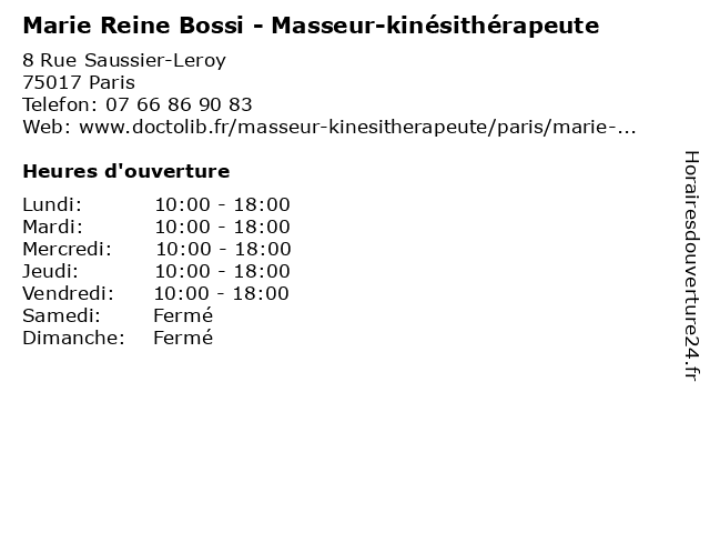 1 Marie Reine Bossi - Masseur-kinésithérapeute (Distance: 0,57 km) 4 avenue Hoche, 75008 Paris bossi, consultation, drainage, kinésithérapeute, marie, massage, masseur, ondes de choc, reine, rééducation 2 Maître Jeanne Bossi Malafosse - Avocate (Distance: 0,50 km) 4 bis rue du Colonel Moll, 75017 Paris avocat, avocate, bossi, droit, jeanne, malafosse, maître, négociation 3 Reine Optique (Distance: 1,26 km) 61 Rue Louise Michel, 92300 Levallois Perret divers, détail, magasins, nra, optique, reine 4 Sergio Bossi (Distance: 2,21 km) 33 Rue d'Amsterdam, 75008 Paris balayage, bossi, coiffeur, coiffure, coloration, coupe, mèche, sergio 5 Dr Philippe Bossi - Infectiologue (Distance: 4,29 km) 211 Rue de Vaugirard, 75015 Paris bossi, consultation, docteur, dr, infectiologue, med, médecin, philippe, traitement 6 Dr Alberto Bossi - Onco-radiothérapeute (Distance: 5,09 km) 65 Avenue Foch, 92250 La Garenne-Colombes alberto, bossi, consultation, docteur, dr, med, médecin, onco, radiothérapeute, traitement |