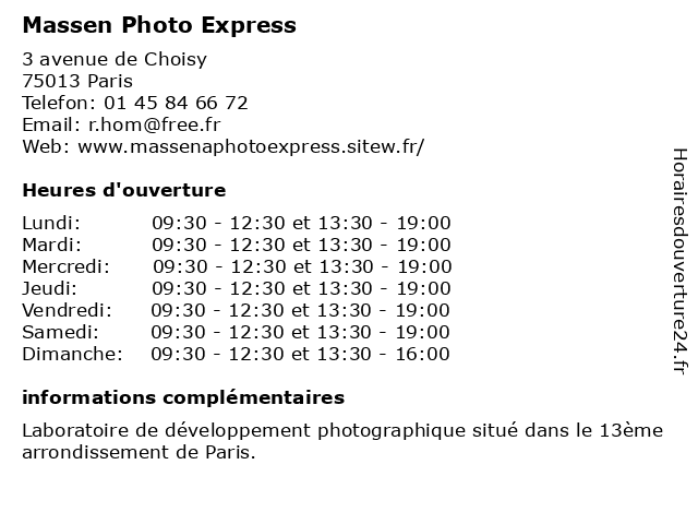 | Vendredi | 09:30-12:30 et 13:30-19:00 |