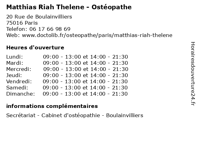 1 Matthias Riah Thelene - Ostéopathe (Distance: 2,00 km) 89 Boulevard Murat, 75016 Paris actes et symptômes, expertises, matthias, ostéopathe, ostéopathie crânienne, ostéopathie pédiatrique, riah, thelene 2 Maître Matthias Humeau - Avocat (Distance: 2,32 km) 28 rue Dumont d’Urville, 75116 Paris avocat, droit, humeau, matthias, maître, négociation 3 Maître Matthias Louette - Avocat (Distance: 2,43 km) 50 Avenue Marceau, 75008 Paris avocat, droit, louette, matthias, maître, négociation 4 Maître Matthias Heyberger - Avocat (Distance: 2,98 km) 75 Avenue des Champs-Élysées, 75008 Paris avocat, droit, heyberger, matthias, maître, négociation 5 Maître Matthias Rubner - Avocat (Distance: 3,11 km) 45 Rue Saint-Dominique, 75007 Paris avocat, droit, matthias, maître, négociation, rubner 6 Maître Matthias Triolle - Avocat (Distance: 3,72 km) 9 Avenue de Messine, 75008 Paris avocat, droids, justice, matthias, maître, triolle |