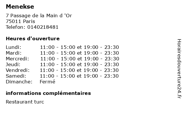 | Samedi | 11:00-15:00 et 19:00-23:30 |