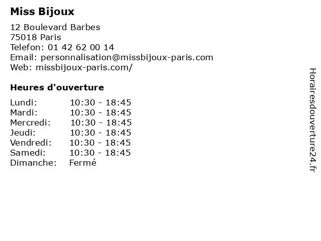 1 France Bijoux (Distance: 0,13 km) 168 Boulevard de Magenta, 75010 Paris, France bijouterie paris, bijoux, bijoux paris, france, paris bijouterie, paris bijoux 2 Coiffure Miss Fairouz (Distance: 0,51 km) 94 rue de Maubeuge, 75010 Paris beauté, brushing, coiffeur, coiffure, coupe, fairouz, institut, lissage, miss 4 Satellite Paris - Bijoux Ethniques (Distance: 0,98 km) 43 Rue des Abbesses, 75018 Paris bijoux, bracelets, ethniques, horlogerie, paris, satellite 5 Miss Coquines (Distance: 1,56 km) 7 Boulevard Poissonnière, 75002 Paris chaussures, coquines, enfant, homme, lingerie, miss, mode femme 6 |