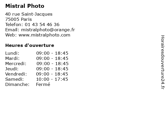 1 Mistral Photo (Distance: 0,28 km) 13 Rue de l'École de Médecine, 75006 Paris copy, impression, mistral, photo, reprographie 2 Le Mistral (Distance: 0,85 km) 2 Place Du Chatelet, 75004 Paris brasserie, happy hour, le, mistral, restaurants 4 Borne d'impression photo Speedlab (Distance: 1,32 km) Voirie Souterraine des Halles, 75001 Paris borne, d'impression, photo, speedlab 5 6 Photo Online (Distance: 1,82 km) 11 rue des Tanneries, 75013 Paris laboratoires, online, photo, photographiques, révélé |