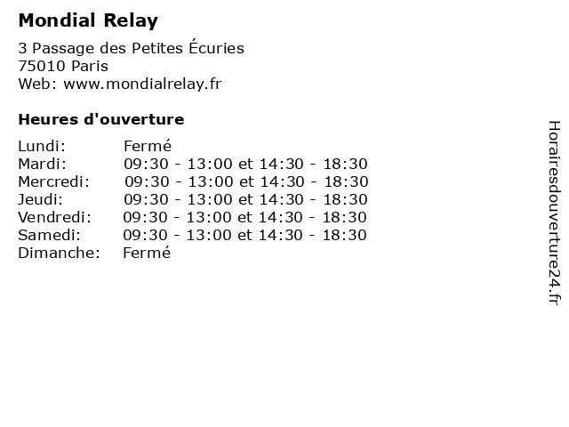 1 Mondial Relay (Distance: 0,40 km) 71 Rue du Faubourg Saint Martin, 75010 Paris assurances, banques, mondial, mondial relay, relay, services 2 Mondial Relay (Distance: 0,44 km) 70 Rue du Faubourg-Saint-Martin, 75010 Paris assurances, banques, mondial, mondial relay, relay, services 3 Mondial Relay (Distance: 0,46 km) 24 Rue Blondel, 75002 Paris assurances, banques, mondial, mondial relay, relay, services 4 Mondial Relay (Distance: 0,65 km) 29 Boulevard de Magenta, 75010 Paris assurances, banques, mondial, mondial relay, relay, services 5 Mondial Relay (Distance: 0,71 km) 30 Rue de Clery, 75002 Paris assurances, banques, mondial, mondial relay, relay, services 6 Mondial Relay (Distance: 0,75 km) 52 Rue de Maubeuge, 75009 Paris assurances, banques, mondial, mondial relay, relay, services |