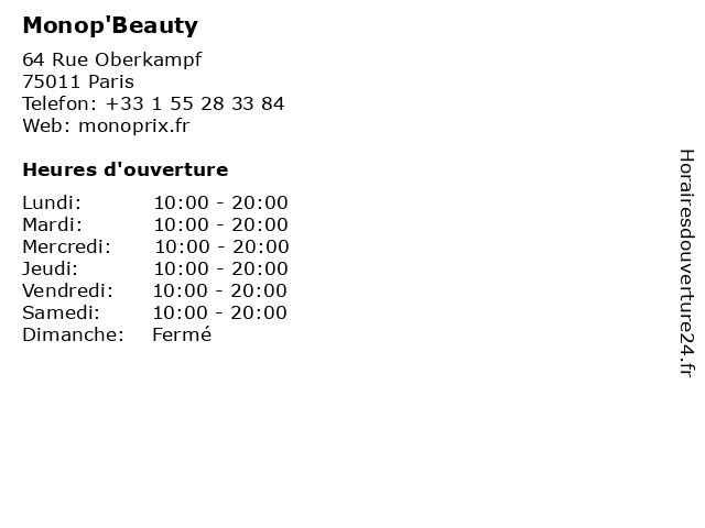 1 Monop' (Distance: 0,10 km) 89 rue d'Oberkampf, 75011 Paris alimentation, fruits, légumes, monop', monoprix, supermarché, épicerie 2 Beauty paris (Distance: 0,60 km) 20 Boulevard du Temple, 75011 Paris beauty, beauté, paris, spa, épilations 4 Monop Beauty (Distance: 2,02 km) 59 rue de Montorgueil, 75002 Paris alimentation, beauty, epiceries, fruits, légumes, monop, monoprix 5 Monop Beauty (Distance: 2,14 km) 43-49 Place Louis Armand, 75012 Paris beauty, gare, hygiene, monop, service 6 Monop'Daily (Distance: 2,20 km) . Place Louis Armand, 75517 Paris cafe, care, chaussures, enfants, homme, lingerie, mode femme, monop'daily, restaurant, service, shopping |