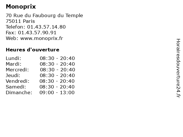 1 Monoprix (Distance: 1,33 km) 13-15 Avenue Secretan, 75019 Paris alimentaire, alimentation, courses, distributeur, monoprix, supermarché, supérette, épicerie 3 Monoprix (Distance: 1,76 km) 22 Rue Sainte Croix Bretonner, 75004 Paris hypermarchés, magasins, monoprix, supermarchés 5 Monoprix (Distance: 2,12 km) 88 rue de Rivoli, 75004 Paris hypermarchés, magasins, monoprix, supermarchés 6 Monoprix (Distance: 2,39 km) 117 rue des Flandres, 75019 Paris alimentaire, alimentation, courses, crimée, distributeur, monoprix, supermarché, supérette, épicerie |