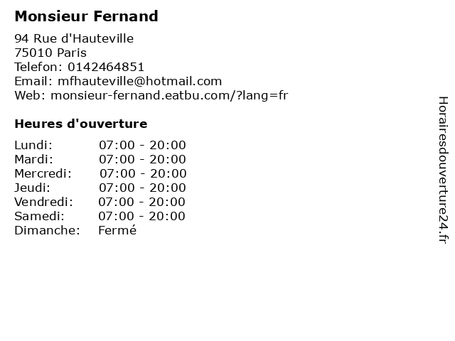 1 Monsieur Robert Bolland (Distance: 0,28 km) 4 Rue Saint Vincent De Paul, 75010 Paris bolland, restaurants, robert 2 Big Fernand (Distance: 0,38 km) 55 Rue du Faubourg Poissonnière, 75009 Paris américain, atelier, big, burger, burgers, fast, fernand, food, hamburger, menus, rapide, restaurant, restauration 3 AP-HP Groupe hospitalier Lariboisière - Fernand-Widal (Paris) (Distance: 0,57 km) 2 Rue Ambroise Paré, 75475 Paris ap, docteur, fernand, groupe, hospitalier, hp, lariboisière, medecins, paris, sante, widal 5 Monsieur Le Zinc (Distance: 0,72 km) 16 Rue de Mazagran, 75010 Paris alcool, bar, bière, café, cocktail, le, monsieur, restauration, zinc 6 Dr. Monsieur C. Cardey -Kinésithérapeute (Distance: 0,72 km) 16 rue de l'Aqueduc, 75010 Paris c., cardey, consultation, docteur, dr., kinésithérapeute, monsieur, santé |