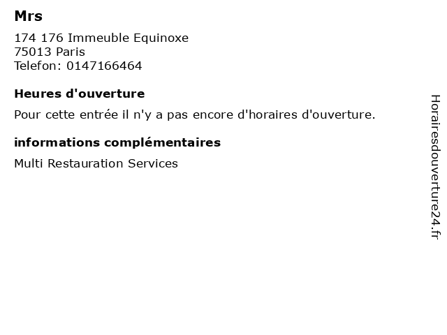 1 Mrs (Distance: 2,69 km) 61 Rue Des Archives, 75003 Paris mrs, multi, restaurants, restauration, services 2 Mrs (Distance: 3,11 km) 18 Rue Saint Denis, 75001 Paris mrs, multi, restaurants, restauration, services 3 Mrs (Distance: 3,94 km) 12 Avenue Raspail, 94250 Gentilly mrs, multi, restaurants, restauration, services 4 Mrs (Distance: 5,31 km) 27 Avenue Des Murs Du Parc, 94300 Vincennes mrs, multi, restaurants, restauration, services 5 Mrs (Distance: 6,40 km) 118 Rue Du Mont Cenis, 75018 Paris mrs, multi, restaurants, restauration, services 6 Mrs (Distance: 7,24 km) 48 Rue Eugene Berthoud, 93400 St Ouen mrs, multi, restaurants, restauration, services |