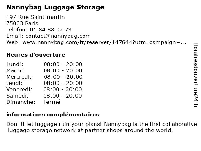 1 Nannybag Luggage Storage (Distance: 0,13 km) 30 Rue De Turbigo, 75003 Paris luggage, nannybag, storage 2 Nannybag Luggage Storage (Distance: 0,28 km) 125 Rue Saint-martin, 75004 Paris luggage, nannybag, storage 3 Nannybag Luggage Storage (Distance: 0,34 km) 22 Rue Des Gravilliers, 75003 Paris luggage, nannybag, storage 4 Nannybag Luggage Storage (Distance: 0,36 km) 199 Rue Saint-denis, 75002 Paris luggage, nannybag, storage 5 Nannybag Luggage Storage (Distance: 0,47 km) 26 Rue Saint-sauveur, 75002 Paris luggage, nannybag, storage 6 Nannybag Luggage Storage (Distance: 0,48 km) 2 Rue Des Innocents, 75001 Paris luggage, nannybag, storage |
