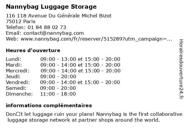 1 Nannybag Luggage Storage (Distance: 1,17 km) 201 Rue De Charenton, 75012 Paris luggage, nannybag, storage 2 Nannybag Luggage Storage (Distance: 1,17 km) 199 Rue De Charenton, 75012 Paris luggage, nannybag, storage 4 Nannybag Luggage Storage (Distance: 1,56 km) 279 Rue Du Faubourg Saint-antoine, 75011 Paris luggage, nannybag, storage 6 Nannybag Luggage Storage (Distance: 2,96 km) 18 Avenue Du Général De Gaulle, 94700 Maisons-Alfort luggage, nannybag, storage |