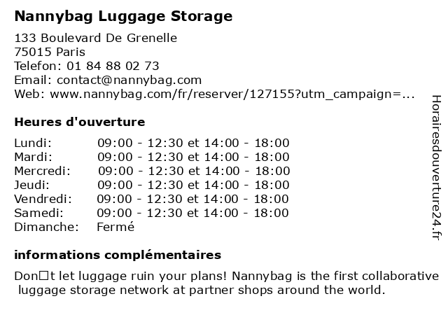 2 Nannybag Luggage Storage (Distance: 0,16 km) 63 Avenue De La Motte-picquet, 75015 Paris luggage, nannybag, storage 3 4 Nannybag Luggage Storage (Distance: 1,29 km) 20 Rue De L'ingénieur Robert Keller, 75015 Paris luggage, nannybag, storage 6 Nannybag Luggage Storage (Distance: 1,81 km) 74 Boulevard Edgar Quinet, 75014 Paris luggage, nannybag, storage |