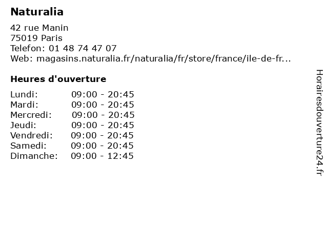1 Naturalia (Distance: 0,66 km) 70 Rue Botzaris, 75019 Paris boulangerie, bébé, cosmétique, enfant, epicerie salée, epicerie sucrée, hygiène, naturalia 2 Naturalia (Distance: 0,92 km) 43 Rue André Joineau, 93310 Le Pré-Saint-Gervais bio, boissons, epicerie, fruits, légumes, naturalia, produits 3 Naturalia (Distance: 1,15 km) 2 Rue du Jourdain, 75020 Paris alimentaire, alimentation, bio, biologique, magasin, naturalia, produits, supermarché, épicerie 4 Naturalia (Distance: 1,34 km) 8 Avenue Corentin Cariou, 75019 Paris boulangerie, bébé, cosmétique, enfant, epicerie salée, epicerie sucrée, hygiène, naturalia 5 Naturalia (Distance: 1,34 km) 59 rue de Meaux, 75019 Paris boiss, boulangerie, bébé, cosmétique, enfant, epicerie salée, epicerie sucrée, hygiène, italie, maman, naturalia 6 Naturalia (Distance: 1,50 km) 5054 avenue Jean Jaurès, 75019 Paris bio, boissons, epicerie, fruits, légumes, naturalia, produits |