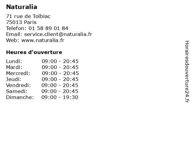 | 1 Naturalia (Distance: 0,97 km) 24 avenue d'Italie, 75013 Paris bio, boissons, epicerie, fruits, légumes, naturalia, produits 2 Naturalia (Distance: 1,46 km) 13-15 rue Brillat Savarin, 75013 Paris alimentaire, alimentation, bio, biologique, magasin, naturalia, produits, supermarché, épicerie 3 Naturalia (Distance: 2,59 km) 22 rue d'Aligre, 75012 Paris alimentaire, alimentation, bio, biologique, courses, distributeur, naturalia, supermarché, supérette, épicerie 4 Naturalia (Distance: 3,01 km) 59 rue Saint-Antoine, 75004 Paris boiss, boulangerie, bébé, cosmétique, enfant, epicerie salée, epicerie sucrée, hygiène, italie, maman, naturalia 5 Naturalia (Distance: 3,03 km) 13 Rue Brézin, 75014 Paris alimentaire, alimentation, bio, biologique, magasin, naturalia, produits, supermarché, épicerie 6 Naturalia (Distance: 3,35 km) 119 rue Montreuil, 75011 Paris alimentaire, alimentation, bio, biologique, magasin, naturalia, produits, supermarché, épicerie |