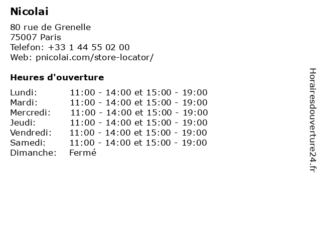 2 Nicolai (Distance: 1,75 km) 240, rue Saint-Jacques,, 75005 Paris magasins, nicolai, parfumeur, services 4 Nicolai (Distance: 3,01 km) 24 boulevard de Courcelles, 75017 Paris magasins, nicolai, parfumeur, services 5 Nicolai (Distance: 3,19 km) 69 avenue Raymond Poincaré, 75116 Paris magasins, nicolai, parfumeur, services 6 Nicolai (Distance: 4,52 km) 31 rue de Chartres,, 92200 Neuilly-sur-Seine magasins, nicolai, parfumeur, services |
