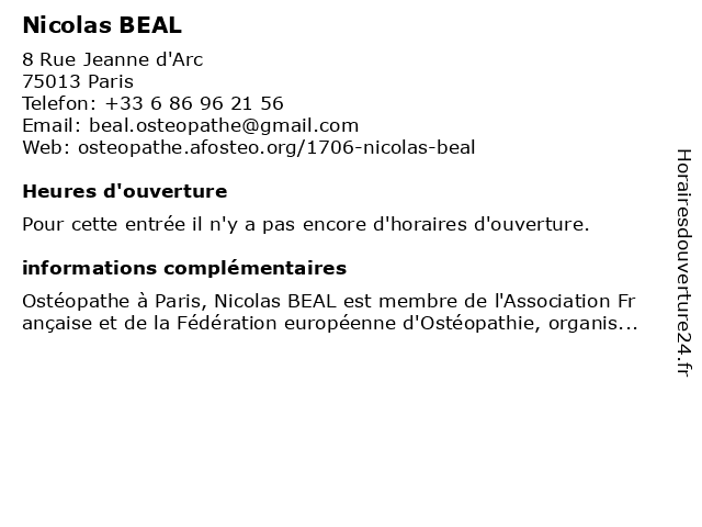 2 Nicolas Béal - Ostéopathe (Distance: 0,01 km) 8 rue Jeanne D'Arc, 75013 Paris bien-être, béal, nicolas, ostéopathe, santé, services 3 Nicolas Jeanne d'arc (Distance: 0,05 km) 5 Rue Jeanne d'Arc, 75013 Paris champagnes, cidre, d'arc, jeanne, nicolas, rhums, rosé, ruinart, spiritueux, vins, vins blancs, vins rouges, whiskies 5 Dr Nicolas Meyer - Chirurgien-dentiste (Distance: 0,64 km) 44 Rue Charles Moureu, 75013 Paris chirurgien, dentiste, dr, meyer, médecin, médecine, médical, nicolas, pharmaceutique, traitement 6 Nicolas (Distance: 0,89 km) 3 Place Jean, 75013 Paris champagnes, hyper-supermarchés, nectars, nicolas, vente au détail de vin, vin |